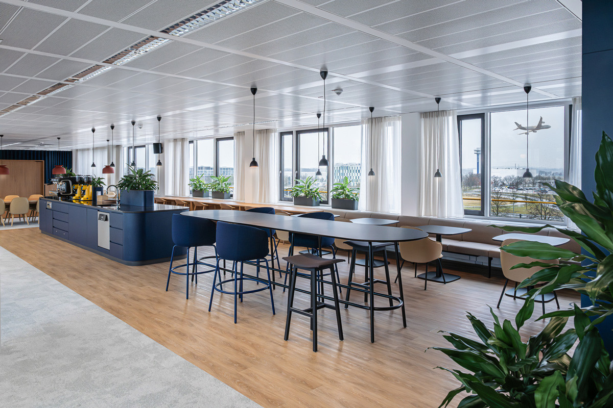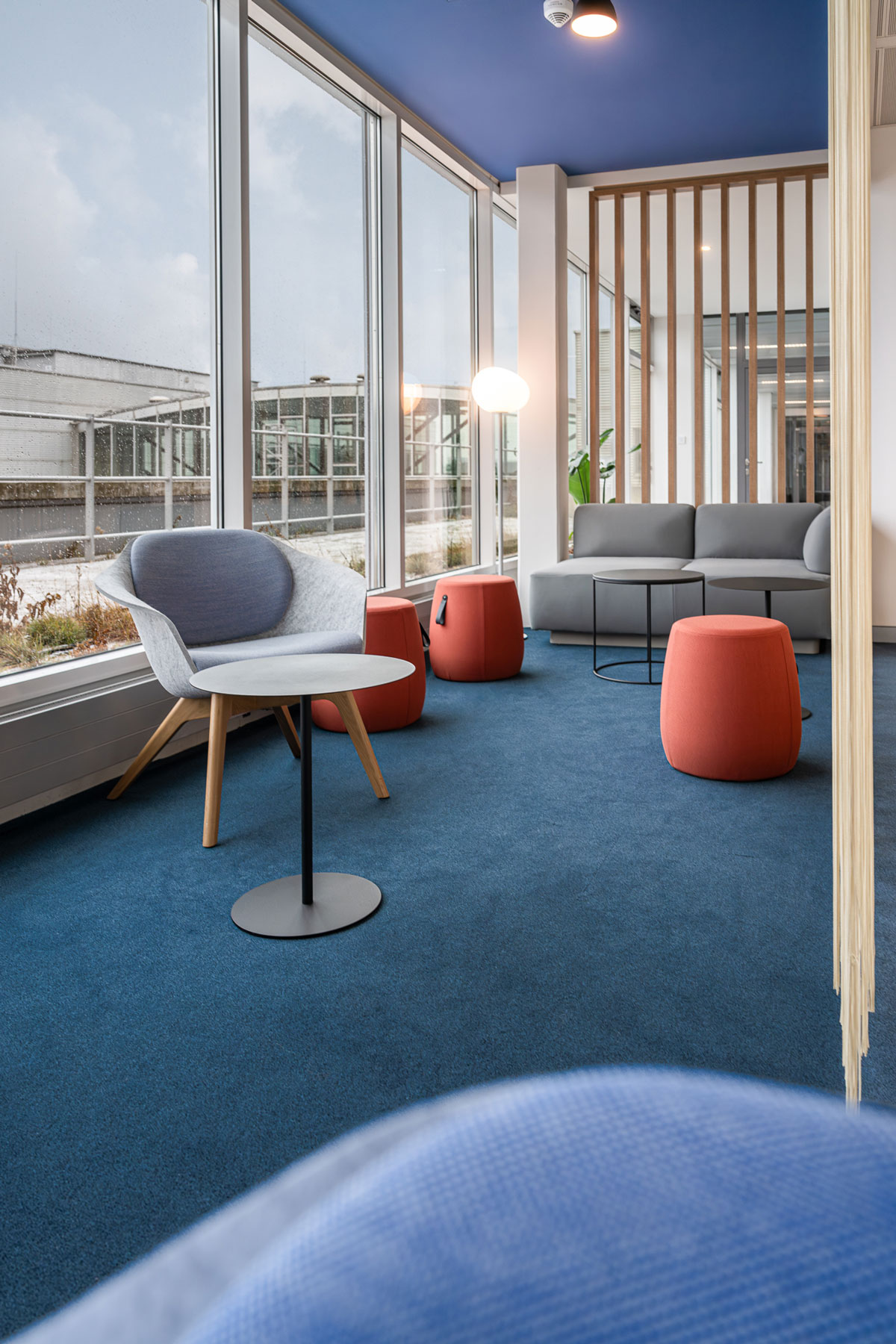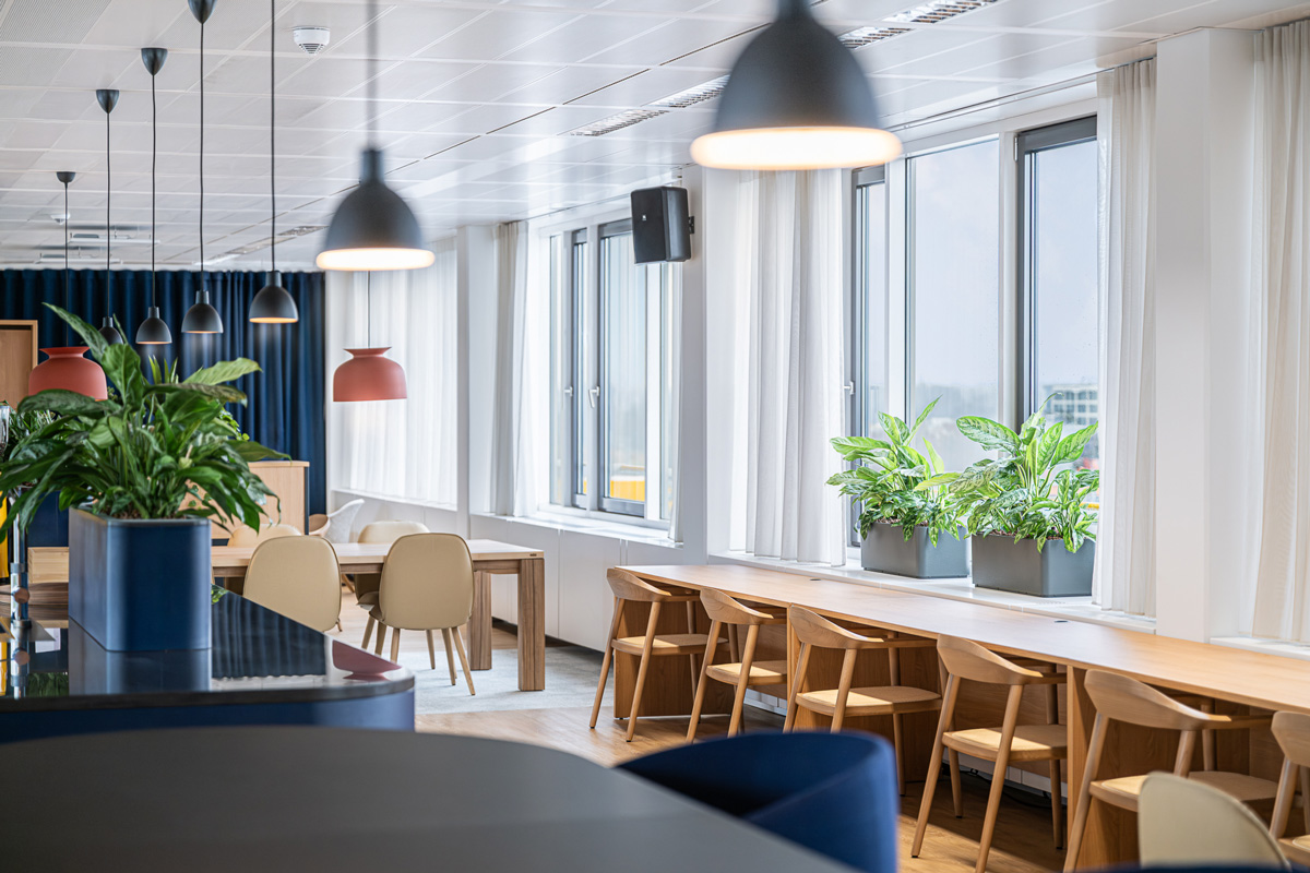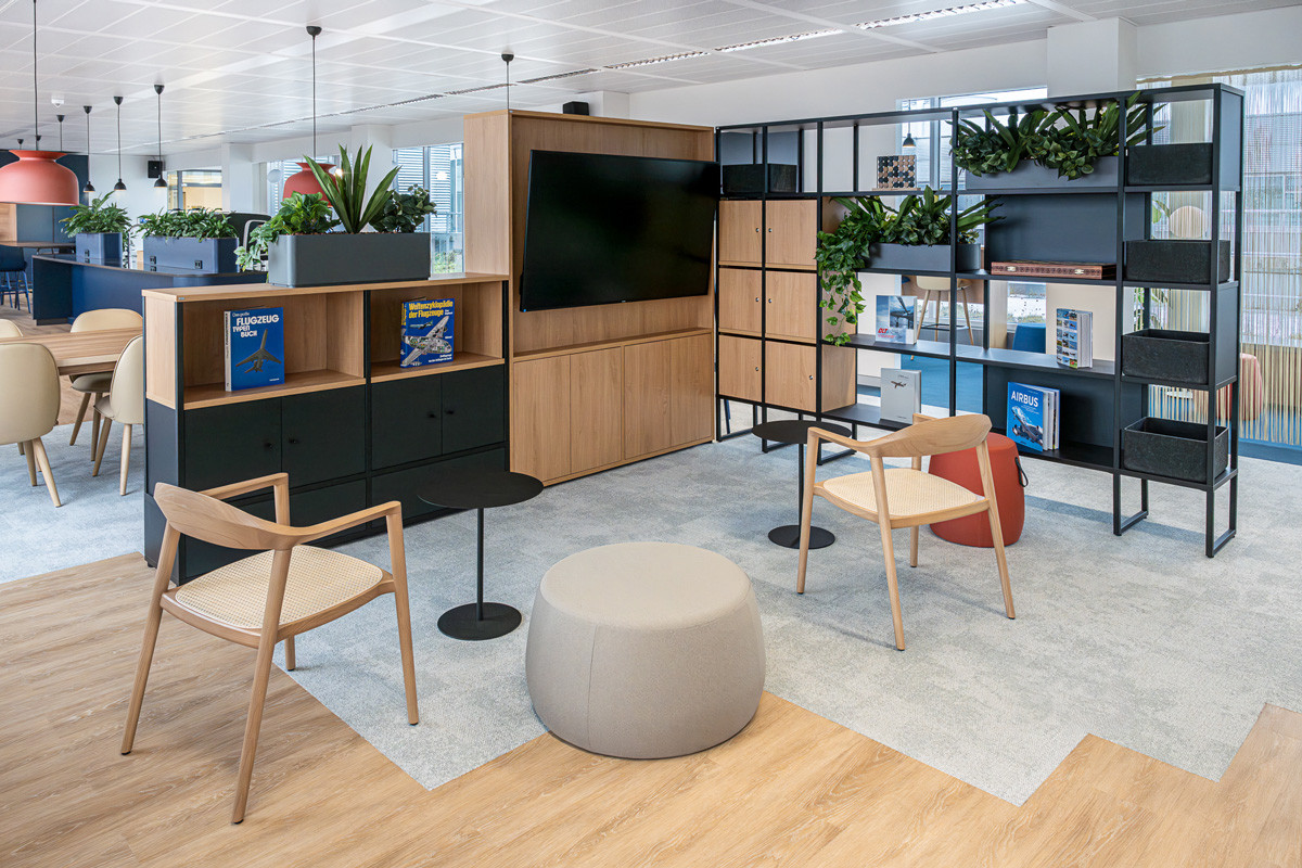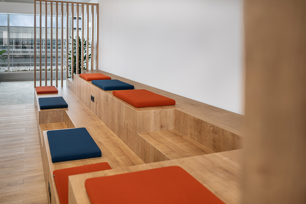 Im Rahmen des Umbaus der Interaction Area übernahmen wir die Schreinerleistungen und setzten ein Innenraumkonzept um, das gezielt auf die Schaffung von Orten der Begegnung ausgerichtet ist. Die Küchenzeile mit Coffeepoint bildet das kommunikative Herzstück und fördert den informellen Austausch der Mitarbeitenden. Ergänzt wird der Raum durch eine Arena mit Sitzstufen, die eine offene und flexibel nutzbare Sitzlandschaft schafft. Zur klaren Strukturierung des Innenraums wurden Raumteiler aus Lamellen eingesetzt, die Offenheit und Zonierung miteinander verbinden. Natürliche Materialien sorgen für eine angenehme, warme Atmosphäre und unterstützen ein hochwertiges, einladendes Gesamtbild.