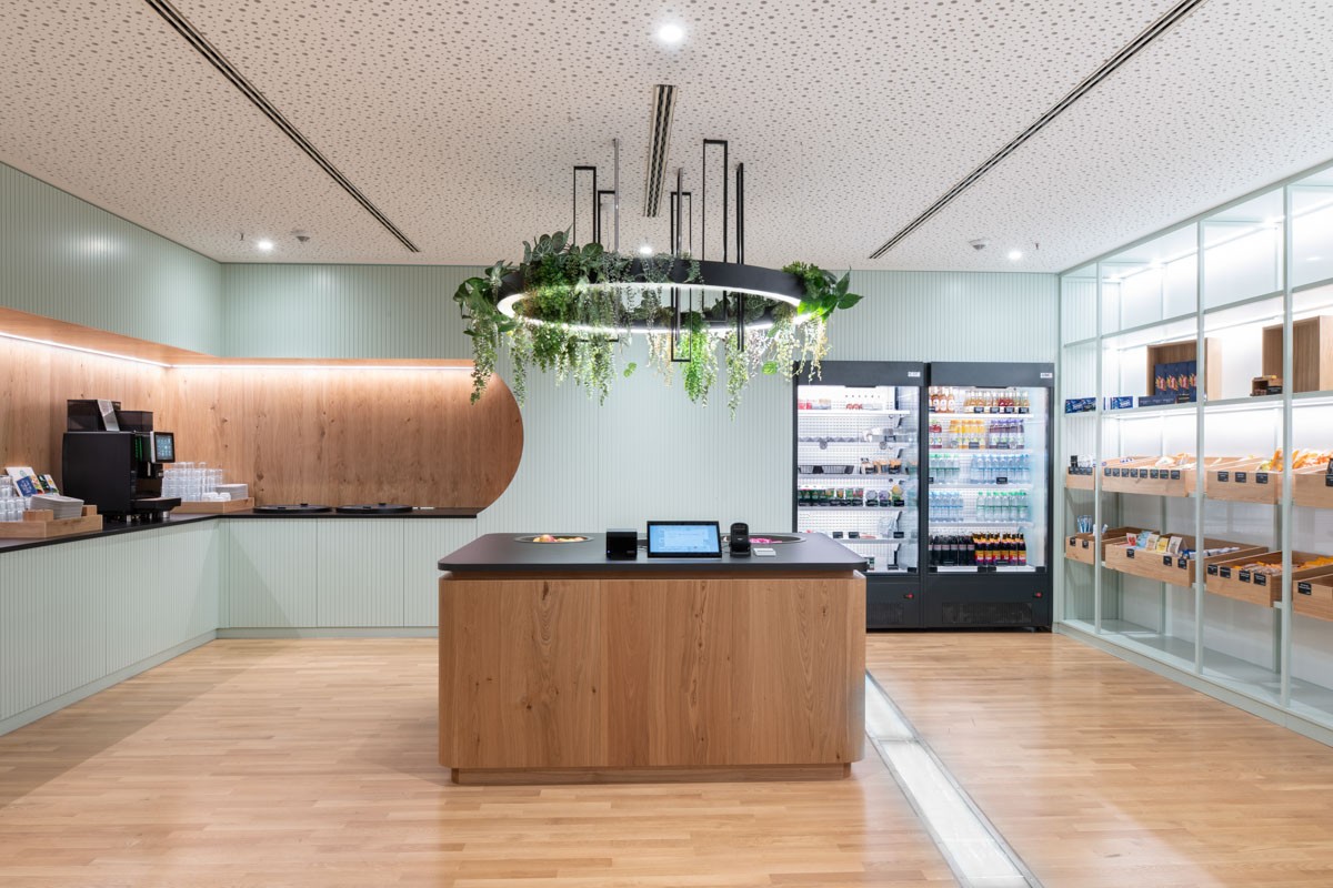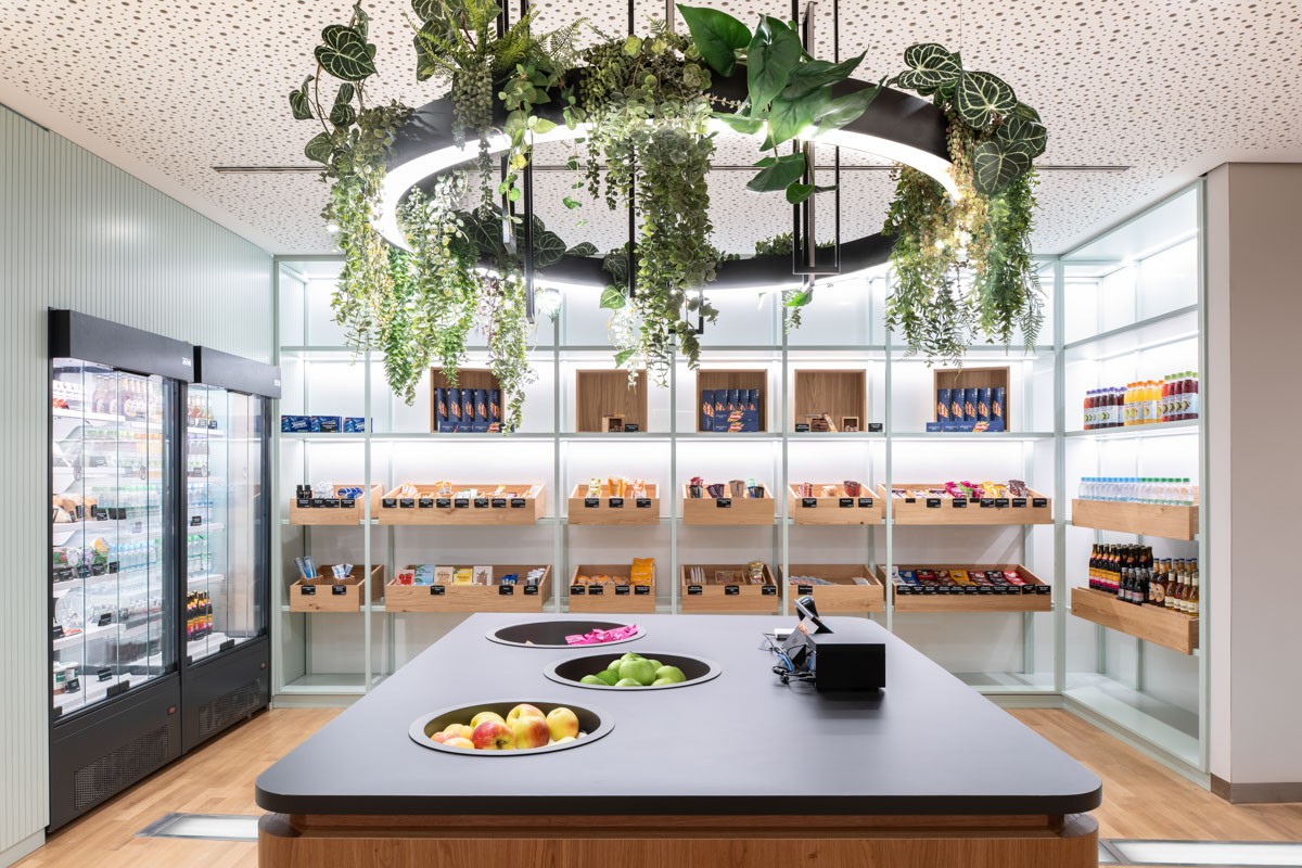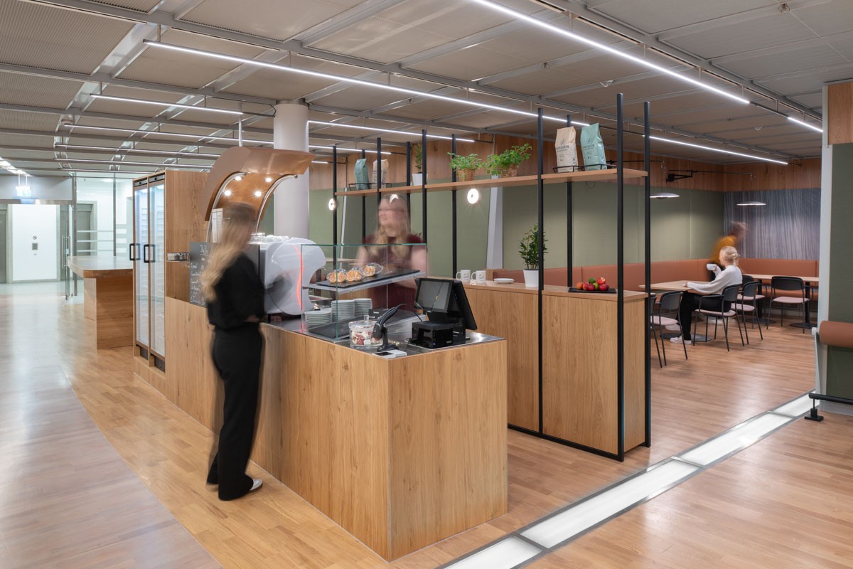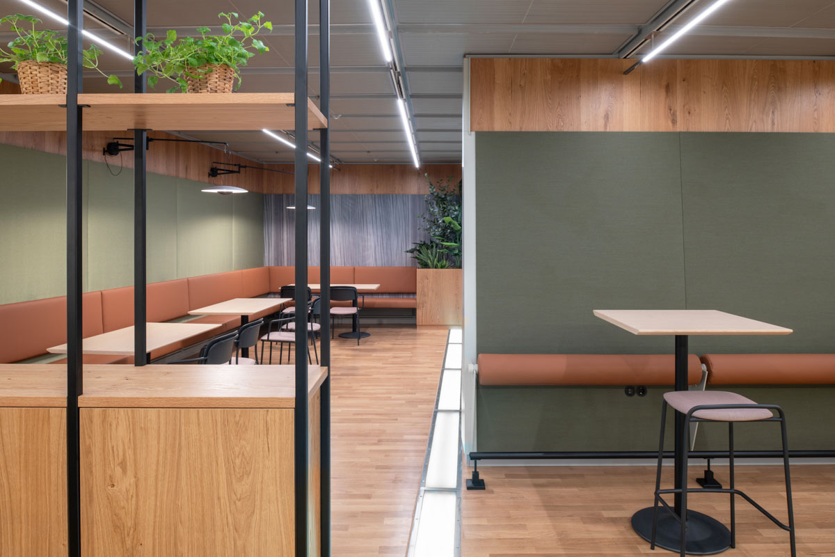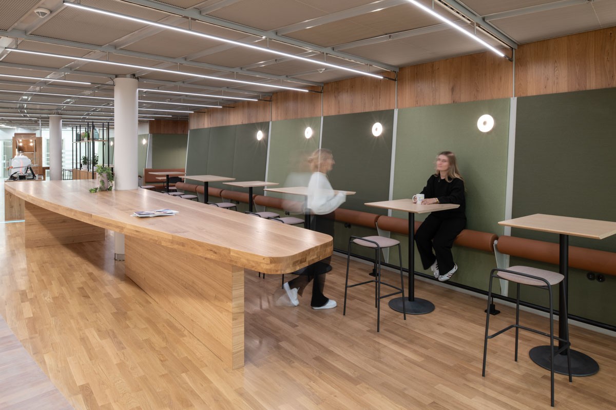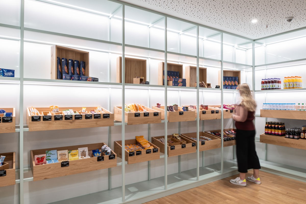 Der neu gestaltete Aufenthaltsbereich zeichnet sich durch eine einladende Atmosphäre und einen qualitativ hochwertigen Ausbau aus. Ein besonderes Highlight sind die langen, massiven Hochtische, die zum Austausch und gemeinsamen Arbeiten anregen. Das Konzept wird durch einen gemütlichen Sitz- und Stehbereich ergänzt, der flexibel genutzt werden kann. Das Herzstück ist die Café-Bar mit integriertem „Trust Shop“, in dem den Mitarbeitenden Kaffee, Getränke und Snacks zur Verfügung stehen. Sie bildet einen Ort der Begegnung und des Wohlbefindens im Arbeitsalltag.